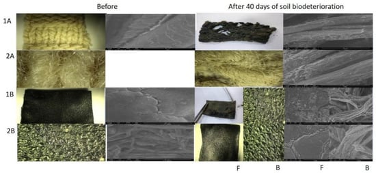 4]. In our experiments, both cellulose-based woven materials were high biodegradable after 40 days of being buried in direct contact with soil, and the process is not uniform. Both materials were severely attacked by microorganisms, as can be easily observed in SEM images, with a higher rate of biodeterioration and weight loss (%) for the linen sample in soil #1. Arshad et al. (2014) concluded that biodegradation of fibers containing cellulose proceed in similar way, with a faster effect linked to the structure of linen materials because fibers are not tightly twisted in linen fabric compared with cotton [