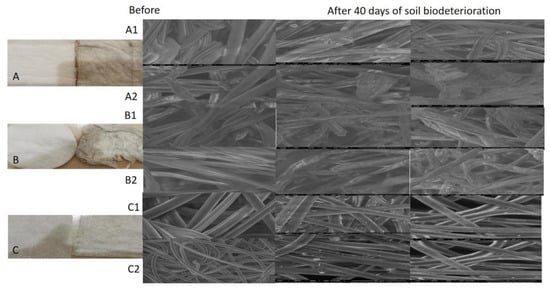 Table S1—Supplementary Files). The mass reduction due to biodegradability was calculated for wet wipes and cosmetic pads. In the case of cosmetic pads, the weight loss (%) calculation was influenced by incomplete removal of soil particles, and visual/SEM pictures have proved the presence of numerous damaged fibers. All wet wipes samples lost weight, with a maximum of 24.332% for antibacterial wipes in soil #1. Still, these seem to be generated by the chemical substance leak into soil rather than microbes’ effect on the fiber structure. At the end of the experiment, antimicrobial and sanitary wipes were very dry. Their weight was slightly higher than the weight of samples dried for 24 h in the laboratory desiccator. For sanitary pads buried in soil for 40 days, SEM images did not show significant changes in their structure for either brand or soil. The biodegradation of hygiene and sanitary disposable PCPs is related to their composition and structure and less influenced by the ground or brand type.