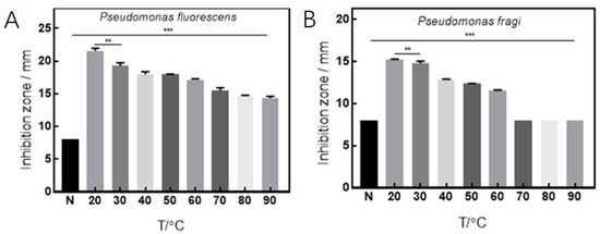 Antibacterial effects of D. algida via the treatment at different temperatures against the target Pseudomonas, where (A,B) are P. fluorescens and P. fragi, respectively. The data are shown as mean ± SD (n = 3), ** p < 0.01, *** p < 0.001.