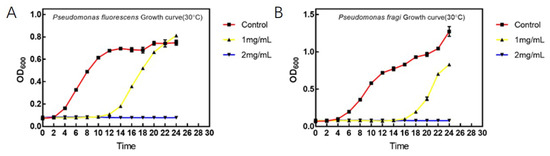 Minimum Inhibitory Concentration (MIC): The CFS of D. algida obtained via the approach in Section 2.1 was utilized to produce the solid freeze-dried powder of the CFS by drying process. The seed liquid of P. fluorescens and P. fragi was, respectively, inoculated into the various TSB media, where the final concentrations of the solid freeze-dried powder were 0, 2, 4, 6, 8, 10, 12, 14, and 16 mg/mL, to be cultured at 28 °C for 24 h. Then, the value of OD was measured, and the MIC that indicated the minimum concentration to inhibit bacteria was also determined.