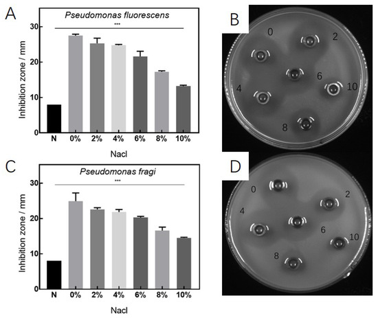 Antibacterial effects under different salinities of D. algida on the target Pseudomonas, where (A,B) are the diameter and appearance, respectively, of the produced inhibition zone of P. fluorescens, and (C,D) are the diameter and appearance, respectively, of the produced inhibition zone of P. fragi. The numbers in (B,D) stand for the salinities. The data are shown as mean ± SD (n = 3), *** p < 0.001.