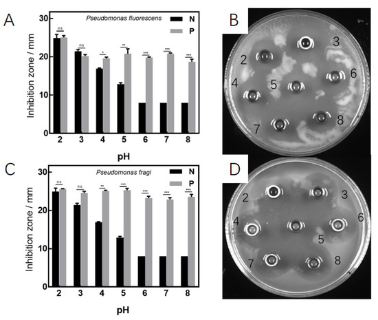 Antibacterial . effects under different pH of D. algida against the target Pseudomonas, where (A,B) are the diameter and appearance, respectively, of the produced inhibition zone of P. fluorescens, and (C,D) are the diameter and appearance, respectively, of the produced inhibition zone of P. fragi. The numbers in (B) and (D) stand for the pH. The data are shown as mean ± SD (n = 3), * p < 0.05, ** p < 0.01, *** p < 0.001.