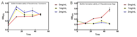 Antibacterial effects of D. algida on the biofilm during the development stage of the target Pseudomonas, where (A,B) are the absorbance values of P. fluorescens and P. fragi, respectively, under different MIC. The data are shown as mean ± SD (n = 3).