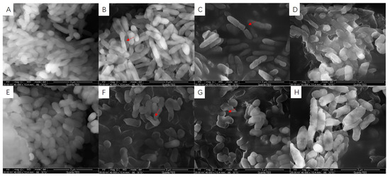 Antibacterial effects D. algida on biofilm appearance observed by SEM (40,000× magnification) of the target Pseudomonas, where (A–D) are the blank control, 0.5 MIC, 1 MIC, 2 MIC, respectively, of P. fluorescens, while (E–H) are the blank control, 0.5 MIC, 1 MIC, 2 MIC, respectively, of P. fragi.
