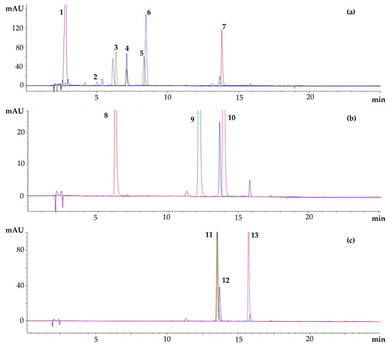 DAD chromatograms at (a) 280 nm, (b) 330 nm, and (c) 360 nm of CSU2 (blue line) compared to reference standards of (1) gallic acid, (2) epigallocatechin, (3) catechin, (4) 4-hydroxy-benzoic acid, (5) epigallocatechin gallate, (6) syringic acid, (7) epicatechin gallate, (8) chlorogenic acid, (9) 4-hydroxy-coumaric acid, (10) ferulic acid, (11) rutin, (12) myricitrin, and (13) quercitin.