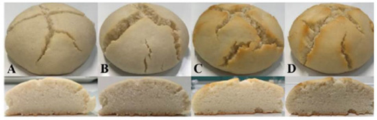 Gluten-free bread sample: PB (bread prepared without kefir) (A), PKB50 (bread prepared with 50 mL of kefir) (B), PKB150 (bread prepared with 150 mL of kefir) (C), PKF5 (bread prepared with 150 mL of kefir fortified with CSU2 (5.0 mg per gram of kefir) (D).