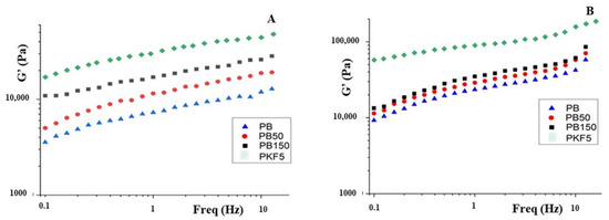 It can be noted that the elastic modulus (G’), although maintaining the same frequency profile, increases when there is a quantity of kefir greater than 50 mL in the mixture (samples PKB50 and PKB150), reaching maximum values when the antioxidant extract was added (sample PKF5). This rheological behavior is indicative of a greater structuring of the doughs, in terms of the greater interaction strength between the links of the formed network.