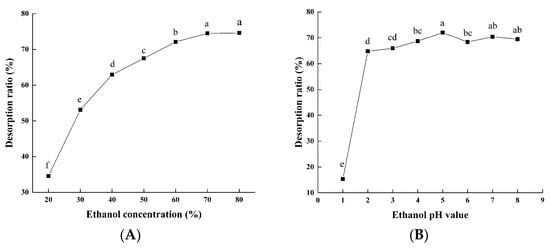 Effects of ethanol concentration (A) and pH value (B) on desorption rate of macroporous resin. Experiments were performed in triplicate, and data are expressed as the mean ± SE. Different lowercase superscript letters denote statistically significant differences (p < 0.05).
