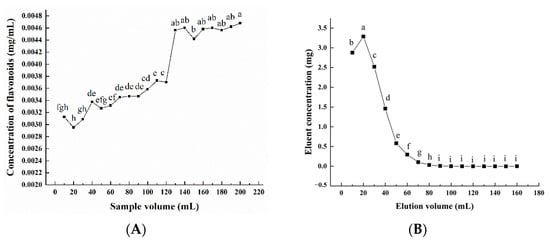 Effect of sample volume (A) and elution volume (B) on the desorption rate of macroporous resin. Experiments were performed in triplicate, and data are expressed as the mean ± SE. Different lowercase superscript letters denote statistically significant differences (p < 0.05).