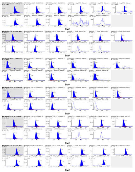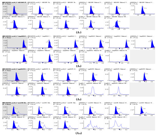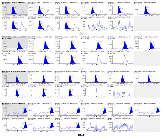 Non-targeted metabolomics analysis using ultra-performance liquid chromatography–tandem mass spectrometry (UPLC-MS/MS) is a rapid and highly sensitive method for detecting plant metabolites and is based on information present in scientific databases [11]. The chemical identification of metabolic characteristics discovered in data sets recorded on LC-MS systems often begins with an accurate measurement of the m/z, and observations of the m/z can be utilized to match a metabolic feature to a single or limited number of molecular formulae. Following the identification of single or multiple molecular formulas, they were matched to known metabolites by searching an array of online or laboratory-specific resources (including MassBank (http://www.massbank.jp/ (accessed on 17 December 2019)), KNAPSAcK (http://kanaya.naist.jp/KNApSAc/ (accessed on 17 December 2019)), HMDB (http://www.hmdb.ca/ (accessed on 17 December 2019)) [12], MoTo DB (http://www.ab.wur.nl/moto/ (accessed on 17 December 2019)), METLIN (http://metlin.scripps.edu/index.php/ (accessed on 17 December 2019)) [13], and MWDB (metware database); and the content of relevant components in the samples was calculated based on the retention times of metabolites and the intensity of ion flow from the ion detection of PFDF. The analytical conditions were as follows: HPLC column, Waters ACQUITY UPLC HSS T3 C18 (1.8 μm, 2.1 mm × 100 mm); solvent system, water (0.04% acetic acid)–acetonitrile (0.04% acetic acid); gradient program, 100:0 v/v at 0 min, 5:95 v/v at 11.0 min, 5:95 v/v at 12.0 min, 95:5 v/v at 12.1 min, and 95:5 v/v at 15.0 min; flow rate, 0.40 mL/min; temperature, 40 °C; and injection volume, 5 μL. The mass spectrum peaks of all substances were integrated by peak area after receiving the mass spectrum analysis data of PFDF metabolites, and the mass spectrum peaks of the same metabolite in various samples were integrated and corrected [14].