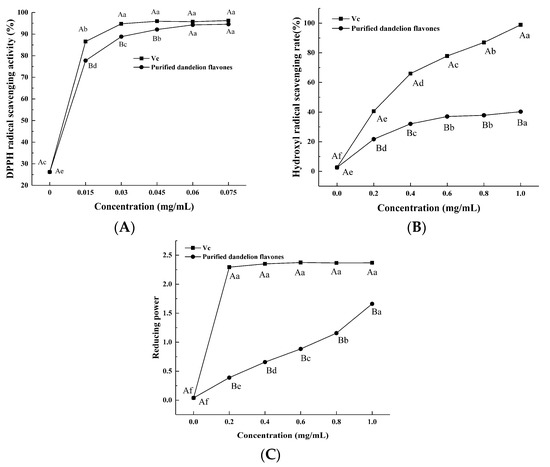 DPPH is a stable free radical with a maximum absorbance of 517 nm and is commonly employed as a reagent to test the free-radical scavenging ability of antioxidants [23]. The absorbance is lowered when DPPH radicals make contact with a proton donor substrate such as an antioxidant and are scavenged [24,25]. We observed that the DPPH free-radical scavenging capacity of PFDF increased in a dose-dependent manner (Figure 6A). When the concentration was between 0.015 and 0.045 mg/mL, the DPPH scavenging capacity of PFDF was slightly lower than that of vitamin C (VC), while at 0.06–0.075 mg/mL, the PFDF exhibited comparable DPPH free-radical scavenging activity to that of VC. When the concentration reached 0.075 mg/mL, the scavenging rates of PFDF and VC were 94.57% and 96.27%, respectively. Flavonoids are weak acids and have a phenolic hydroxyl structure. It is suggested that the phenolic hydroxyl groups in flavonoids could donate H+ and exhibit free-radical scavenging ability. Sheikh et al. (2015) [26] found similar results, showing that dandelion leaves had strong DPPH free-radical scavenging capacity.