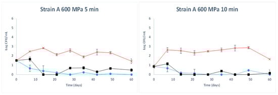 Survival curves of A. acidoterrestris (Strain A) vegetative cells treated at 600 MPa/60 °C for 5 and 10 min and stored at 4 °C (●), 12 °C (■) and 25 °C (×). Data points are mean values ± standard deviation of duplicate samples from two independent experiments (n = 4).