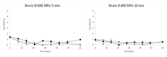 However, at 12 °C, the population of vegetative cells was reduced after day 7, whereas at 4 °C their population reduced throughout storage and was found near the detection limit after day 21 for both HHP treatments of 5 and 10 min. Consequently, vegetative cells can be eliminated with HHP treatment during storage at low temperatures, which is in agreement with Hartyani et al. (2013) [12], who reported that the population of vegetative cells of A. acidoterrestris treated with HHP at three different pressure levels (200, 400 and 600 MPa) at 60 °C for 10 min in orange and apple juice was decreased to the detection limit of the plating method throughout storage at 4 °C for 28 days. As shown in Figure 3, the counts of vegetative cells of strain A were increased and maintained above the initial population throughout storage at 25 °C for 60 days. On the contrary, the vegetative cells of strain B did not follow the same trend, since the population decreased even at 25 °C. This difference between the wild-type strain A and the reference strain B could be attributed to the fact that the effectiveness of the HHP treatment against A. acidoterrestris is strain-dependent [36], presumably due to the different distribution of fatty acids in the membranes of the bacteria [37], although other factors could be cell age, cell population and nutrient availability [38,39].