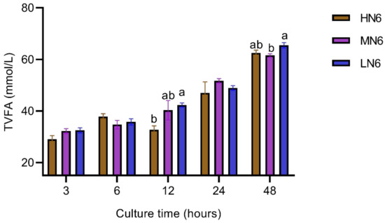 Effects of dietary n-6/n-3 ratio on in vitro total volatile fatty acid (VFA) production at each incubation time. HN6, high n-6 fatty acid treatment (n-6/n-3 ratio = 3.04:1); MN6, moderate n-6 fatty acid treatment (n-6/n-3 ratio = 2.03:1); LN6, low n-6 fatty acid treatment (n-6/n-3 ratio = 0.8:1); TVFA, total volatile fatty acids. Different superscript letters at the same time point indicate a significant difference (p < 0.05), whereas the same or no superscript letters indicate no significant difference. Data are represented by the mean ± SEM.