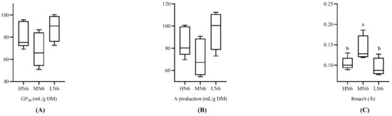 As shown in Figure 2, the total cumulative GP after incubation for 48 h and the asymptotic GP were unchanged by the three dietary treatments, while the maximum rate of substrate degradation (RmaxS) was significantly higher (p < 0.05) in the MN6 group than in the HN6 and LN6 groups.