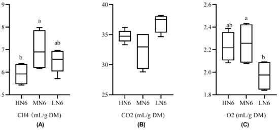 A significantly lower (p < 0.05) CH4 production was observed in the HN6 group than in the MN6 group, while the production of CH4 did not differ between the MN6 and LN6 groups (Figure 3A). The production of O2 was significantly decreased (p < 0.05) in the HN6 and LN6 groups as compared to that in the MN6 group (Figure 3C).