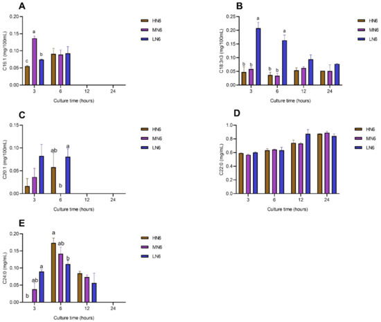 Effects of dietary n-6/n-3 ratio on in vitro fatty acid profiles. (A–E): The concentration of C16:1, C18:3, C20:1, C22:0, and C24:0 in the fermentation fluid. Different superscript letters at the same time point indicate a significant difference (p < 0.05), whereas the same or no superscript letters indicate no significant difference. Data are represented by the mean ± SEM. HN6, High n-6 fatty acid treatment (n-6/n-3 ratio = 3.04:1); MN6, Moderate n-6 fatty acid treatment (n-6/n-3 ratio = 2.03:1); LN6, Low n-6 fatty acid treatment (n-6/n-3 ratio = 0.8:1).