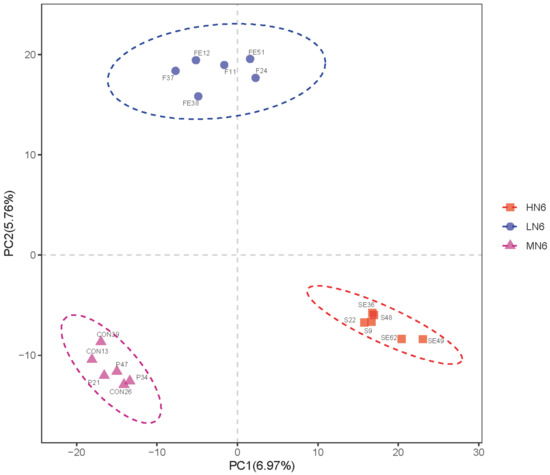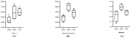 The Chao 1 diversity index value of the HN6 group was significantly lower (p < 0.05) than that of the MN6 and LN6 groups, which did not differ (Figure 5). The observed species richness was significantly lower (p < 0.05) for the HN6 group than for the MN6 group (Figure 5). Shannon diversity index values did not differ among the three dietary groups (Figure 5). The overall picture of the microbial composition of the samples in the three groups was obtained by PCoA (Figure 6), and the p-value of PERMANOVA was 0.210, showing that microbial communities were similar in the tested conditions.
