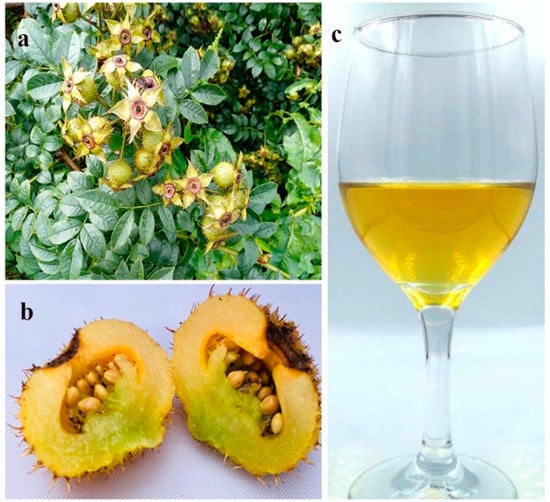 Cili, a local name of Rosa roxburghii Tratt., in Guizhou province, China, which refers to its spiny, pear-shaped, fruit (hips) (Figure 1), is an underutilized plant of the Rosaceae family []. While domestication and utilization of cili has attracted the attention of scholars and government in recent years due to its health-promoting properties [,], there are very few publications concerning the application of contemporary wine fermentation technologies for the production of ‘Western-style’ wines from this fruit; either in Chinese or English.