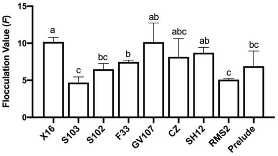 Flocculation of nine yeast strains. Different lowercase letters above the standard deviation bar indicate significant difference (p ≤ 0.05).