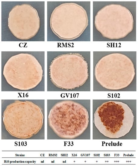After 96 h incubation, the colony color of strains F33 and Prelude were deep brown, S103 was brown, X16, GV107, and S102 were light brown, but CZ, RMS2, and SH12 were white cream (Figure 3). Those results indicated that CZ, RMS2, and SH12 were the strains with the weakest capacity to produce hydrogen sulfide.