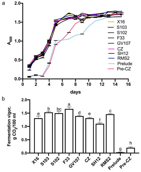 Growth curves (a) and fermentation vigor (b) of yeast strains. Different lower letters in (b) above the standard deviation bar indicate significant difference (p ≤ 0.05).