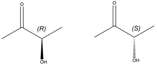 Acetoin (3-hydroxy-2-butanone, AC) is an important chiral substance [1] with a stereogenic center within its four-carbon molecule (Figure 1); it has widespread applications in food [1], chemical industry [2], medicine [3], and other fields. In particular, optically pure AC not only possesses the basic functional properties of AC but also offers a prominent advantage in asymmetric synthesis owing to its unique spatial structure. This feature confers special application value in the synthesis of high-value-added chiral drug intermediates, chemical intermediates, and liquid crystal materials [4,5].