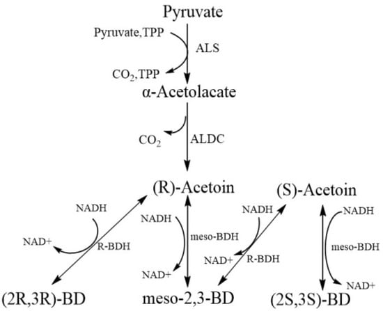Currently, AC is mainly manufactured through chemical methods, yielding racemic mixtures of (R)-AC and (S)-AC. This racemic synthesis limits the application of chemically generated AC [6,7,8]. Given that microorganisms contain a specific 2,3-butanediol dehydrogenase (BDH), high optical purity AC can be produced by biotechnology [9,10]. However, most AC products obtained by microbial fermentation are also a mixture of (R)-AC and (S)-AC [11], which is due to the presence of various types of BDH in bacteria. The AC synthesis pathway in bacteria comprises the following steps (Figure 2): conversion of α-acetolactate to (R)-AC under the catalytic action of α-acetolactate decarboxylase (ALDC) and conversion of (R)-AC to (R,R)-2,3-butanediol (R,R)-2,3-BD) and meso-2,3-BD under the catalysis of different types of BDH [12,13]. The aforementioned conversion reactions of AC to BD catalyzed by BDH are reversible; therefore, the conversion of meso-2,3-BD to (S)-AC may occur. In general, bacteria contain more than one type of BDH [14,15], thereby producing both AC enantiomers. To obtain optically pure AC (i.e., only one AC enantiomer), researchers have used various approaches, including the screening of natural bacterial strains for the synthesis of AC with high optical purity [16], engineering strains that possess BDH with strict enantioselectivity [17,18], and deletion of bdhA gene in AC-producing bacteria, to block the conversion between AC and BD [19]. Several studies have demonstrated the effectiveness of these strategies and the optical purity of AC in the product can be increased to more than 98% [16,19]. In addition, chiral pure AC has been manufactured by enzymatic [20,21] and whole-cell methods [22].