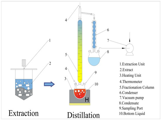 Ethyl acetate was recovered from the AC extracts using a laboratory distillation apparatus (Figure 3), which includes a heating unit (ZNHW-2000, Lichen, China), glass distillation column, condenser, vacuum pump (R-100, Buchi, Switzerland), and collection flask. Periodically record the kettle bottom liquid temperature and take samples of condensate and kettle bottom liquid for analysis during the distillation process.