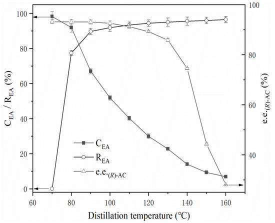 Firstly the ethyl acetate in the extract solution was separated by atmospheric distillation. During the distillation process, the temperature of the kettle bottom liquid gradually increased from 70 °C to 160 °C. Samples of the kettle bottom liquid were taken at different temperature points for analyzing the (R)-AC and (S)-AC content. The results showed that the content of (R)-AC and (S)-AC exhibited different trends with increasing temperatures. The e.e. of (R)-AC showed a slight change within the temperature range of 70–100 °C, a rapid decrease in the temperature range of 100 °C–140 °C, and a gradual decrease from 150 °C onwards (Figure 4). This phenomenon trend suggests that a high temperature may be the main reason caused the conversion of (R)-AC to (S)-AC.