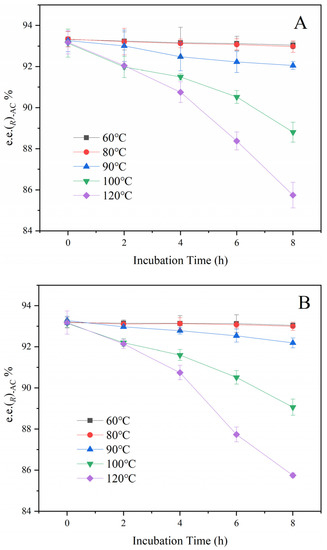 Samples of the fermentation broth, primary AC distillate, and the extract solution were kept warm at 60 °C, 80 °C, 90 °C, 100 °C, and 120 °C separately to estimate the effect of temperature on the racemization. As shown in Figure 5, the e.e. of (R)-AC has no significant changes held at 60–80 °C for 8 h. When the temperature was increased to 90 °C, the e.e. of (R)-AC decreased to about 92% at the end of 8 h. At 100 °C and 120 °C, the e.e. of (R)-AC decrease rate was significantly increased during the holding time. The rate of conversion between (R)-AC and (S)-AC was not significantly different among the three types of samples (p > 0.05), indicating that the solvents had not affected the interconversion between (R)-AC and (S)-AC. This result provides further evidence that temperature is the key factor promoting the conversion of (R)-AC and (S)-AC, with the rate of conversion increases with the increase in temperature. Under low-temperature conditions, the rate of conversion between (R)-AC and (S)-AC was significantly reduced, suggesting that the conversion of AC enantiomers may be effectively avoided by performing at low temperatures.