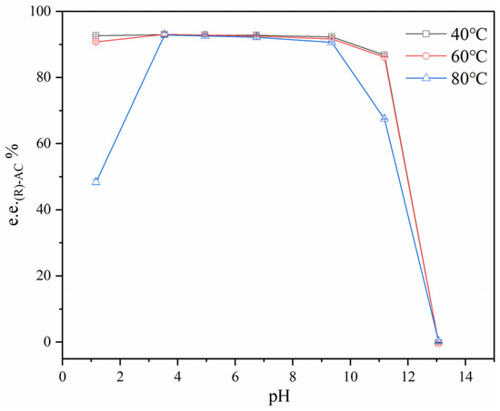 The pH of the primary AC distillate was adjusted to different values using hydrochloric acid and sodium hydroxide. Samples with different pH values were incubated at 40 °C, 60 °C, and 80 °C for 4 h to evaluate the effect of pH on the interconversion of the AC enantiomers. Figure 6 shows that the e.e. of (R)-AC significantly decreased at pH was <3.0 or >9.0 and that the rate of the decrease was more rapidly under alkaline conditions. The decrease in the e.e. of (R)-AC also positively correlated with temperature. Therefore, strong acidity and alkalinity accelerated the conversion of (R)-AC to (S)-AC and at a faster rate in alkaline environments. Although strong acidity and alkalinity promoted the conversion of (R)-AC to (S)-AC, the pH of the liquid material remained within the range of 3.5–4.5 during the various stages of AC separation and isolation (Table 1). This phenomenon suggested that pH was not the key factor responsible for the changes in e.e. of (R)-AC during the AC recovery process from fermentation broth.