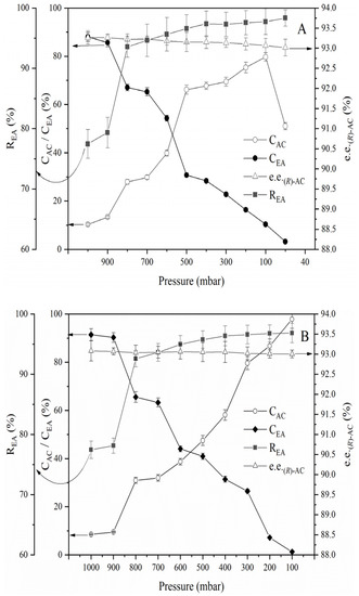 Given that a high temperature is the primary cause of the conversion of (R)-AC to (S)-AC, the maintenance of an appropriate temperature during the AC recovery process will be beneficial in preserving the optical purity of AC. The experimental results described above indicate that temperatures below 80 °C favor the preservation of the optical purity of AC. Thus, the process for ethyl acetate recovery was further investigated. During atmospheric distillation, ethyl acetate began to distill when the temperature of the AC extract increased to 77 °C–78 °C. The liquid temperature gradually increased with a decrease in the ethyl acetate content of the liquid material. At 80 °C, an ethyl acetate recovery rate of up to 78% could be achieved (Figure 4); furthermore, the e.e. of (R)-AC in the liquid material remained essentially unchanged, and the AC content in the kettle bottom liquid was condensed to approximately 100 g/L and the recovery of ethyl acetate in the separation solution was reached to 78% (Figure 7). Ethyl acetate could no longer be distilled off at the atmospheric temperature when the liquid temperature was maintained at 80 °C. Thus, the system pressure had to be decreased to enable further recovery. First, vacuum rotational evaporation was used to recover the ethyl acetate from the AC extract solution at 80 °C and the results are shown in Figure 7A.