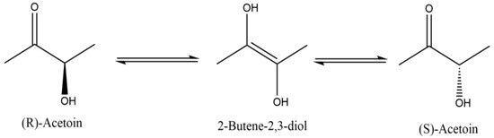 The (R)-AC yield in the fermentation broth of strain 168D, constructed in our previous work, could account for up to 98% of the total AC yield, yet only 50% of the AC crystalline product from the fermentation broth was (R)-AC, with the other half being (S)-AC. This result indicated that (R)-AC was converted to (S)-AC over the course of the separation process, and this phenomenon has never been reported before. In this paper, the high temperature was found as the main factor that promotes the conversion of (R)-AC to (S)-AC. AC is a ketone containing an α-hydroxyl group whose carbonyl group can undergo an enolization reaction similar to that of other ketones. Due to the existence of the alpha-hydroxyl group, the carbonyl enolization of AC results in the formation of 2-butene-2,3-diol [28,29], which is unstable and readily converts back to AC. However, the probability of conversion from 2-butene-2,3-diol to (R)—AC and (S)—AC is equal [30] (Figure 8). This phenomenon is greatly enhanced by high temperatures and strong acids and bases, which led to the results described above.