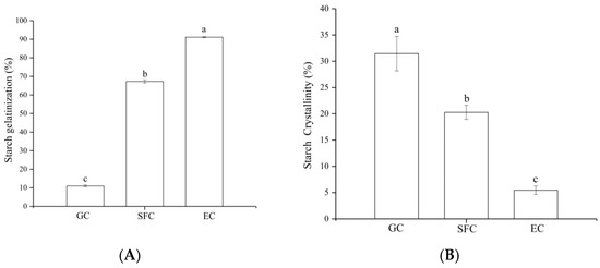 The gelatinization and crystallinity of the starch are shown in Figure 1. The highest percentage of starch gelatinization (91.08%) was observed in EC, followed by SFC (67.29%) and then GC (11.01%, p < 0.05). E and SF increased starch gelatinization by up to 727.25 and 511.17 percent respectively, while the starch crystallinity of EC was the lowest (5.45%), followed by SFC (20.27%) and then GC (31.45%, p < 0.05). E and SF decreased starch crystallinity by up to 82.67% and 35.55% respectively.