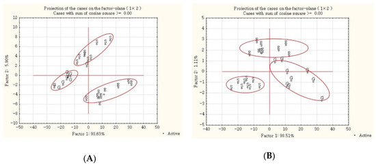 The results of multivariate analysis are shown in Figure 2. Principal component analysis divided the absorption peak regions of total CHO and protein molecules into three independent parts, which indicated that there was significant difference in the absorption peaks of CHO and protein structures between GC, SFC and EC.