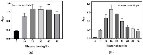 Next, the effects of bacterial age on whole-cell catalysis were evaluated. To achieve this, GABA fermentation was conducted in the fermentation medium supplemented with 20.0 g/L of glucose. Cells were recovered from the fermentation broth at 4, 8, 12, 16, 20, 24, 28, 32, and 36 h and used to conduct whole-cell catalysis. The results demonstrate that bacterial age had an important effect on the catalysis ability of the whole-cell system. The catalysis ability was enhanced with bacterial age from 0 to 16 h, and, thereafter, it gradually decreased with bacterial age (Figure 2h). This resulted from the increase in cell density with fermentation time from 0 to 16 h, followed by a decline with fermentation time beyond 16 h (Figure 1). At 16 h, the fermentative GABA content reached 204.2 ± 2.7 g/L, which can cause a rather high osmotic pressure [13,26]. It is difficult for cells to survive in such a hypertonic environment. With the progression of fermentation, a cell is more vulnerable to dying, possibly resulting from a continuous increase in osmotic pressure. Therefore, the cells fermented for 16 h were chosen for whole-cell catalysis.