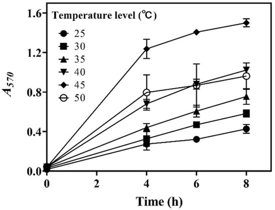 In this section, the effects of incubation temperature (25.0–50.0 °C) on whole-cell catalysis were assessed. The results demonstrate that temperature substantially influenced decarboxylation efficiency. Decarboxylation was enhanced as the temperature was increased from 25.0 to 45.0 °C, and then it decreased with further increases in temperature. Clearly, 45.0 °C was the optimal temperature for the strain to produce GABA in the whole-cell system (Figure 3). Interestingly, the literature has shown that a temperature of around 45.0 °C is favorable for the whole-cell catalytic GABA synthesis performed by L. brevis strains [21,27,28].