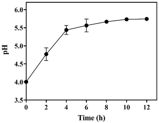 The required L-glutamic acid could be added all at once, but most of it exists in the form of powder, which is ascribed to its low solubility (~6.0 g/L). The dissolution of substrate powder is synchronized with decarboxylation [14,18]. As a result, the dissolved substrate buffers the whole-cell system. We determined the pH profile with time during the whole-cell bioconversion driven by 25.0 g/L of wet cells. As shown in Figure 6, the pH gradually increased with time and followed a trend identical to that of GABA formation (Figure 2, Figure 3 and Figure 4). The increase in pH resulted from the substitution of neutral GABA for acid L-glutamic acid [29]. Reportedly, the optimal pH for the GADs of LAB strains is around 5.0 [4,6]. The pH of the current reaction system was always maintained at around 5.0 (from 4.0 to 5.8). This acidity led to a satisfactory decarboxylation efficiency. A similar outcome was previously obtained in L-glutamic-acid-based GABA fermentations [14,18].