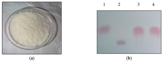 L-glutamic-acid-based GABA fermentation was conducted by using L. brevis CD0817 in the fermentation medium with 20 g/L of glucose. The fermentation was ended after being statically maintained at 30 °C for 16 h. The fermentative GABA concentration was quantitated to be 204.2 ± 2.7 g/L using the HPLC method. The cells were harvested to construct a 500.0 mL whole-cell catalysis system. The system was composed of 25.0 g/L of wet cells and 300.0 g/L of L-glutamic acid (mostly existing as powder). Whole-cell catalysis was carried out statically at 45 °C for 12 h and shaken well every 1.0 h. Upon the completion of the reaction, the solution was boiled for 10 min and then centrifuged at 8000× g and 4.0 °C for 10 min. The GABA titer was determined to be 85.1 g/L using the HPLC method. The substrate residue was 3.7 ± 0.9 g/L. GABA was recovered using the method described in the Materials and Methods Section. The recovery was simple and benefited from the concise bioconversion process. The manufactured GABA product was a white solid powder (Figure 7a). The pre-staining thin-layer chromatogram of the product is shown in Figure 7b.
