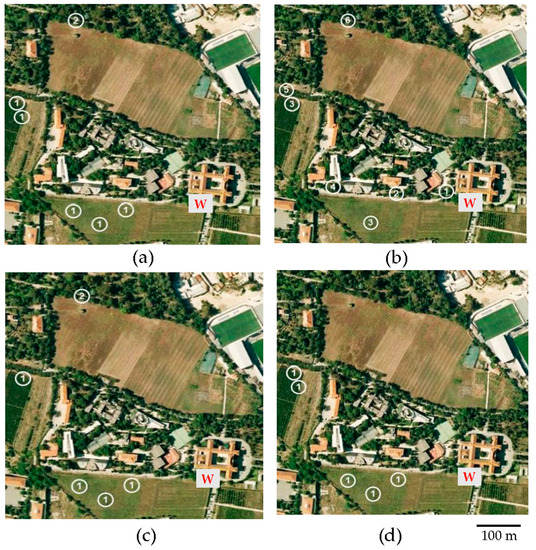 Sites of sampling in the environment at different distance from the winery building (W): (a) soils in vineyards ①, soils in forest zone ②; (b) tree bark, cork oak ①, cypresses ② ⑥, vines ③, Japanese cheesewood ④, wild olive tree ⑤; (c) insects, vineyards ①, forest zone ②; (d) vineyard leaves and grapes ①.