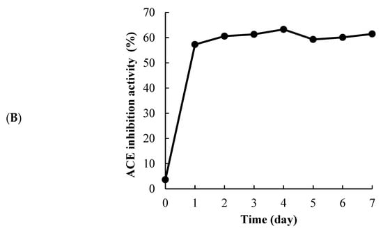 Figure 1A shows the daily changes in viable cell counts and pH of the fermented S. horneri. The viable cell counts increased from 1.0 × 107 to 2.0 × 108 within 1 day of incubation. The pH decreased from 6.47 to 3.99. Figure 1B shows the daily changes ACE inhibitory activity. The ACE inhibition activity of the fermented S. horneri extracted with 80% ethanol was 57% on the first day of incubation, and the maximum ACE inhibition activity was 63% on the fourth day of incubation. Thereafter, the 4-day incubated S. horneri was used as fermented.