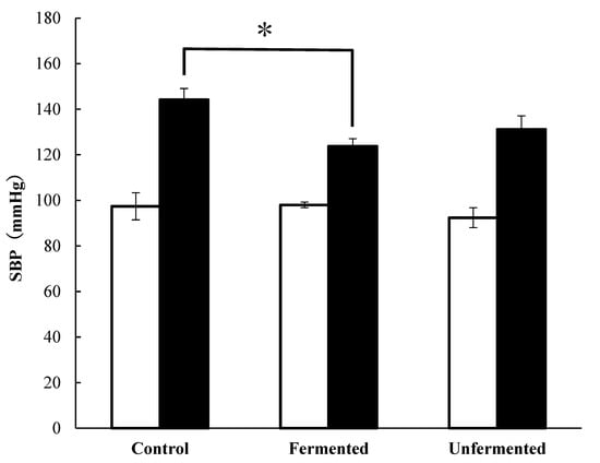 Systolic blood pressure levels before and after AI treatment on the ddY mice are shown in Figure 2. The SBP levels after AI injection were 46 mmHg, 25 mmHg, and 38 mmHg higher in the control, fermented, and unfermented groups, respectively, than before. The systolic blood pressure levels in the fermented group were significantly lower than those of the control group.
