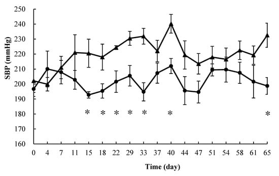 The daily changes in blood pressure levels on the SHR are shown in Figure 3. No significant differences in body weight or food intake were observed among the study segments. The SBP values of the fermentation group were always lower than those of the control group after 7 days. Significant differences were also observed at 15, 18, 22, 29, 33, 40, and 65 days.