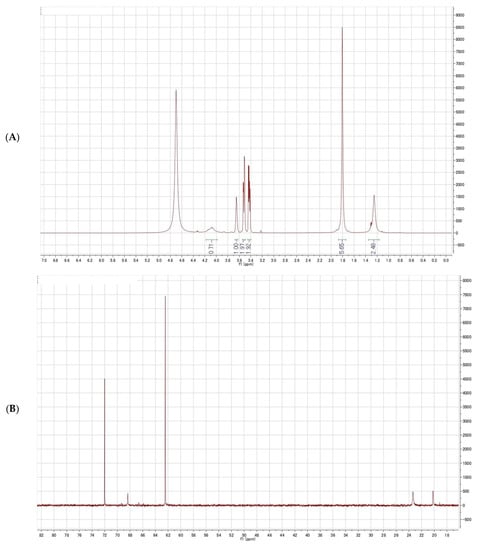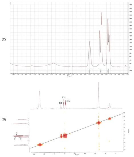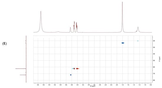 Nuclear magnetic resonance (NMR) spectrum of glycerol; (A) 1H-NMR spectrum of the purified fraction; (B) 1H-NMR spectrum of the purified fraction (enlarged); (C) 1H-1H COSY spectrum of the purified fraction; (D) 13C-NMR spectrum of the purified fraction; (E) 1H-13C HSQC spectrum of the purified fraction.