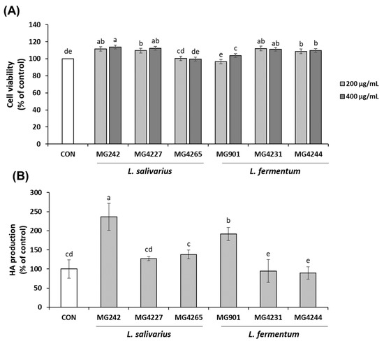 Effect of CFS derived from probiotic bacterial strains on (A) cell viability, and (B) hyaluronic acid (HA) production in HaCaT keratinocytes. Data are represented as mean ± SD (n = 3). Statistical significance is indicated by different letters over the column (p < 0.05).