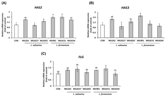 Effect of CFS derived from probiotics on (A) HAS2, (B) HAS3, and (C) FLG mRNA expression in HaCaT keratinocytes. Data are shown as mean ± SD (n = 3). Statistical significance is indicated by different letters on the column (p < 0.05).