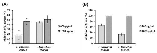 S. aureus, a gram-positive bacterium, is present in the skin, and skin infection by S. aureus can lead to severe conditions, such as abscesses and sepsis [27]. Common skin and soft tissue infections are mainly caused by gram-negative bacteria, such as E. coli [28]. The antibacterial effects of CFSs derived from L. salivarius MG242 and L. fermentum MG901 on S. aureus and E. coli are shown in Figure 3. The amount of S. aureus was reduced by up to 50% upon treatment with CFSs of L. salivarius MG242 and L. fermentum MG901. The CFS of L. salivarius MG242 and L. fermentum MG901 also decreased the amount of E. coli up to 99%. This antibacterial effect of CFS suggests that they can help improve skin health by reducing bacterial infections in the skin.