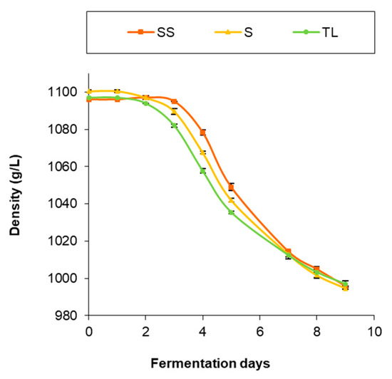 Evolution of density during AF in the different inoculation strategies (SS: spontaneous sulfite, S: spontaneous without SO2, TL: inoculation with T. delbrueckii/L. thermotolerans at vatting without SO2).
