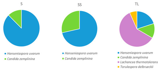 The main species found in the TL samples was L. thermotolerans, one of the yeasts present in the inoculum, followed by those present in the spontaneous fermentations, H. uvarum and Candida zemplinina, and finally, T. delbrueckii, the other species that was part of the mixed inoculum. In wines made with the non-Saccharomyces-mixed inoculum, a significant reduction in the proportion of H. uvarum was observed. Some studies have shown the production of high levels of ethyl acetate and acetic acid by indigenous apiculate yeasts during the early stages of fermentation [22,23], therefore, the reduction of the population achieved with the inoculation would be positive in terms of its bioprotective effect.